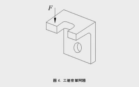 固體力學CAE之主流數值方法為有限元素法(finite element method, FEM),它的基本概念是把一個連續性系統離散化,分成一個個元素(element)與節點(node),統稱為網格(mesh),每個元素均遵守力學基本理論方程式。接著,將所有元素組合成一個系統剛度矩陣聯立方程式 [K][u] = [F],再加入邊界條件,即可應用電腦程式求解各節點的位移與應力。FEM的流程非常規則,寫成電腦程式後即可廣泛應用,不必再利用數學解析方法及手算求解,對於數學方法無法計算的複雜題型亦可迎刃而解。利用FEM我們可以將圖3的題目分割成許多元素,再求得答案,如圖4和圖5所示之FEM網格與求解後之應力場。當然,問題若擴展到3D,這幾乎是必須使用FEM求解,如圖6這類立體複雜結構。當然,圖1和圖2之單純問題亦可採用FEM計算,而FEM相對於手算之數學解析方法,比較省時省力。關於FEM的理論與應用,讀者可參考相關的教科書[註4]。